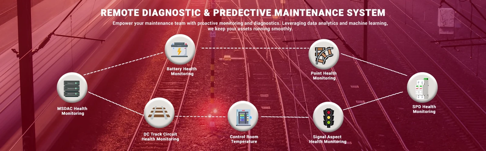 Remote Diagnostic & Predictive Maintenance System (RDPMS) is an IOT based maintenance system that enables the monitoring, analysis and advance maintenance of various types of signaling devices remotely. It collects real-time data from various signaling gears to monitor parameters like temperature, voltage, current, vibration etc. which is transmitted to edge computing via station gateways for real-time data analysis by using AI & Machine Learning algorithms. The analyzed data is then transferred to a Central Cloud hub where the historical trends and real time data patterns are preserved to generate alert insights. This predictive maintenance feature of the system sends early warning signs, alerts or faults to web server and mobile applications. On the basis of those alerts the maintenance activities and preventive measures can be taken ahead of time.